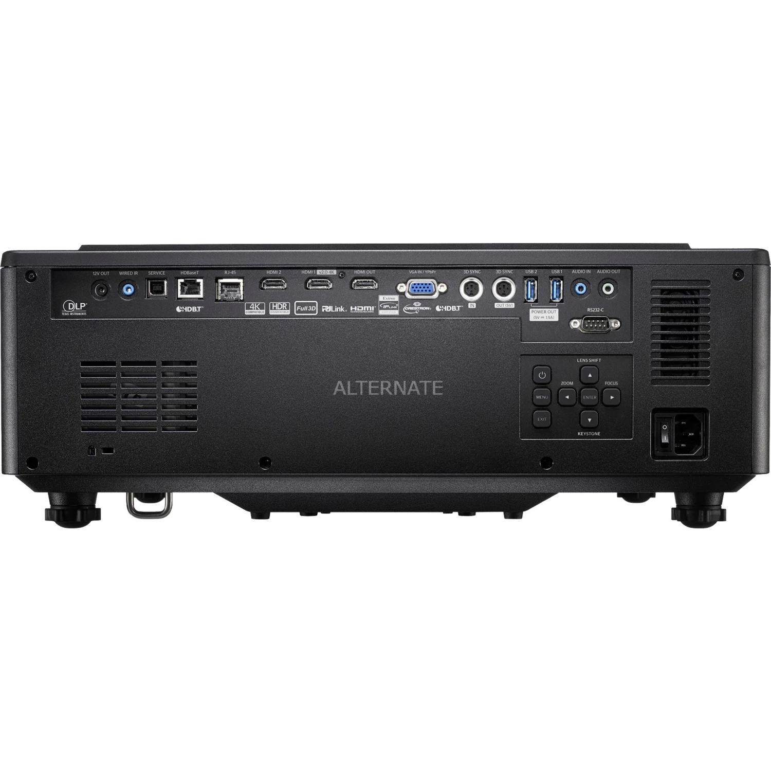 | Feature | Trapezkorrektur, Passwortschutz, Kensington, Lock, IPX5, Schutzklasse, Porträtprojektion, 360°, Projektionen, Warping, und, Edge, Blending, Prozessor, Colour, Management, System, (CMS), Constant, Power, USB, Mediaplayer |
